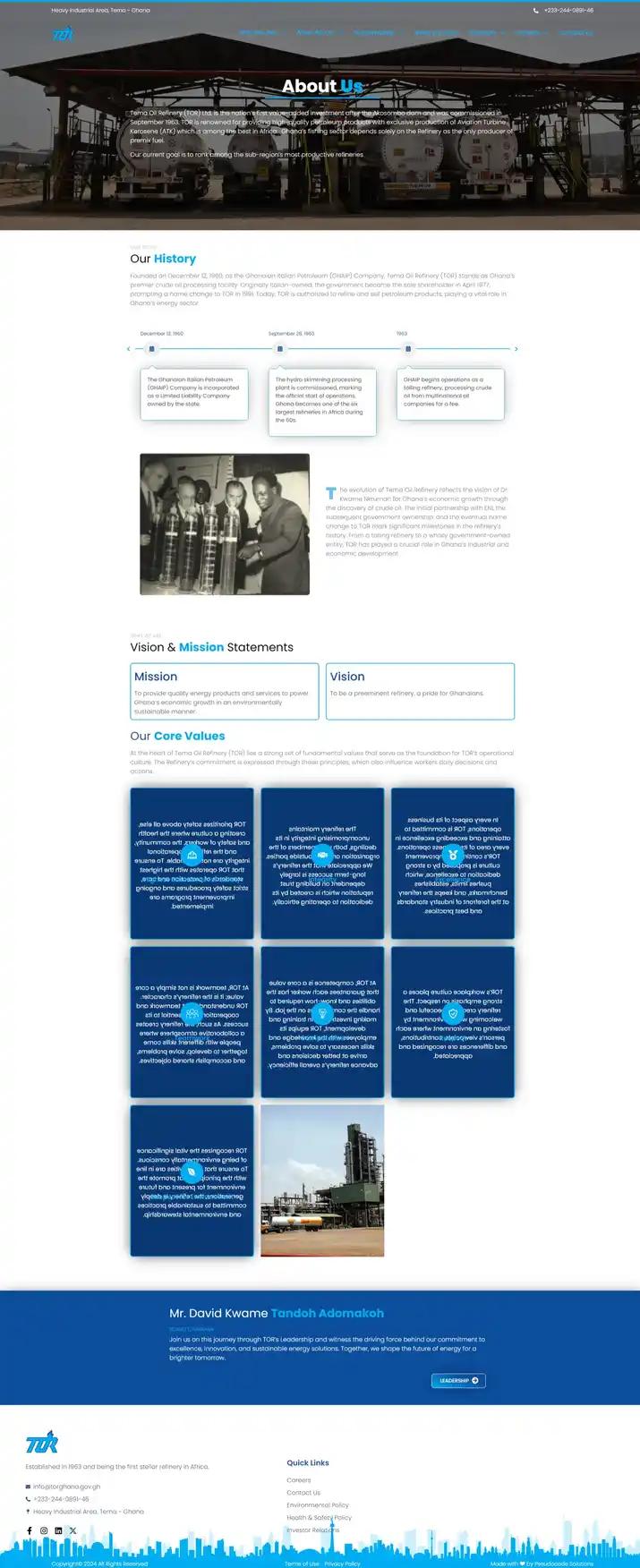 Tema Oil Refinery (TOR) Ltd. is Ghana’s premier oil refinery. With the ideal refinery configuration and sufficient storage tank capacity, it is among the best refineries in Africa and supports the country’s economic growth and investment initiatives.